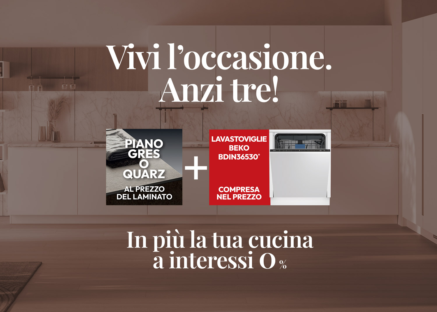 Con l’acquisto di una cucina Scavolini del valore minimo di 6.000,00€ completa del set di elettrodomestici Beko (frigorifero, piano cottura e forno) per te compresa nel prezzo la lavastoviglie Beko BDIN36530 e il piano Gres o Quarz è al prezzo del laminato. Per ordini fino al 14 novembre 2025 con consegna entro il 19 dicembre 2025. *(Sconto pari a € 1.027,00: valore a listino della lavastoviglie Beko BDIN36530) **Maggiori dettagli su scavolini.com/vivi-l-occasione